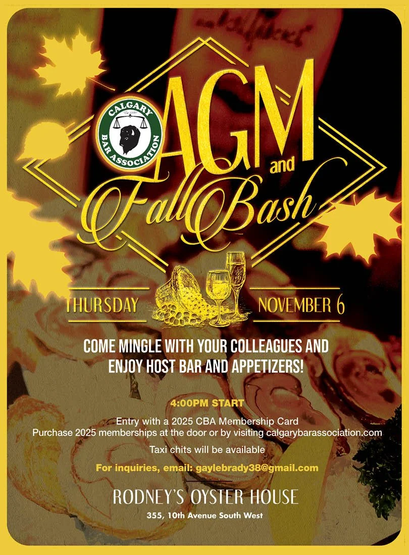 The Constitution of the Calgary Bar Association requires the members to meet annually in the month of November at such time and place as Council may select. And members have been happy to comply each November since 1916. As the years have passed, the meeting portion of the gathering has become shorter and shorter, with business now usually conducted between 4:00 and 4:02. This leaves lots of time for socializing with colleagues at the bar, catching up with old friends and meeting new ones.