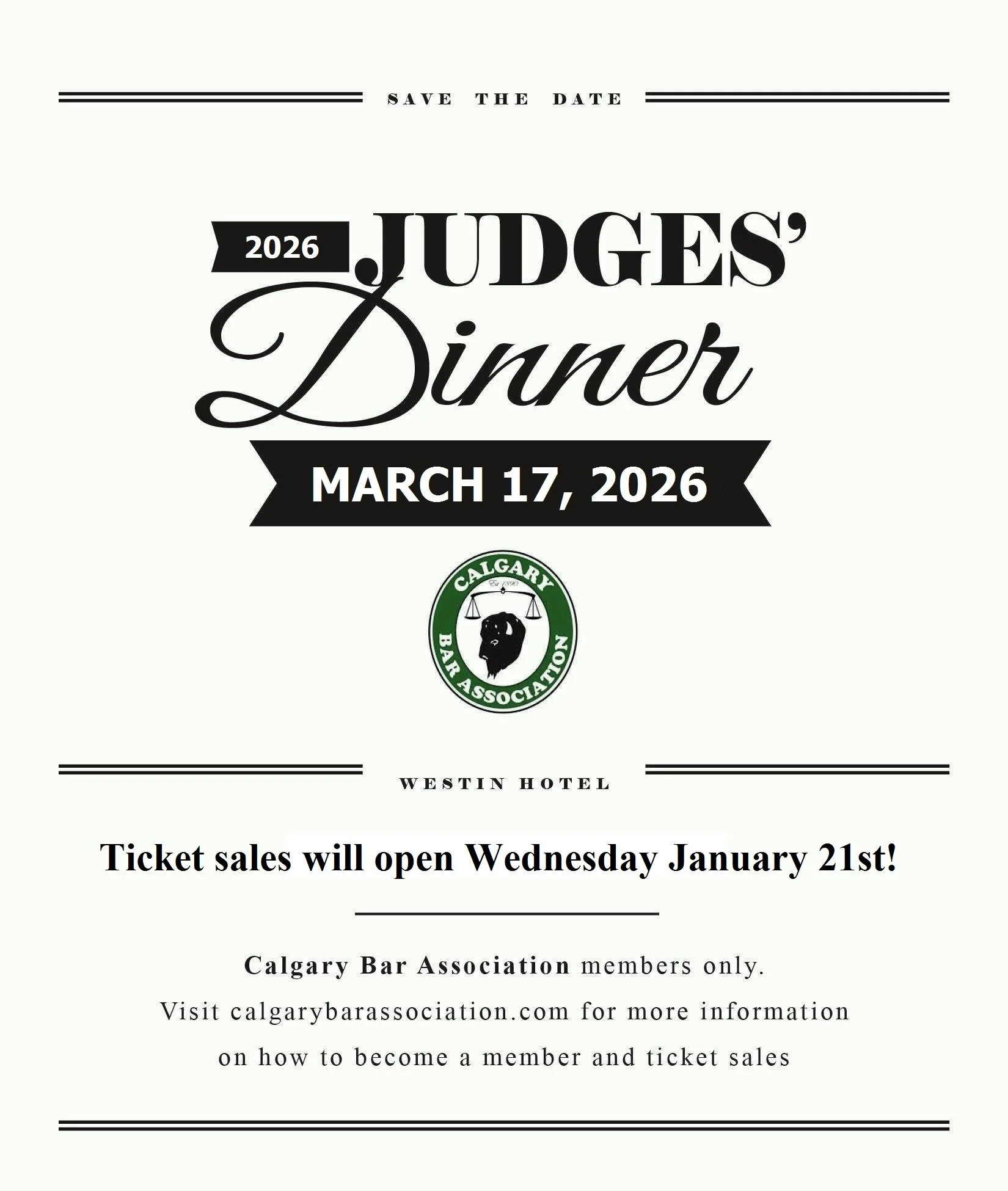 The dinners are usually sold out, so get your tickets early. KC and Judges' Dinners are open to Calgary Bar Association members only.